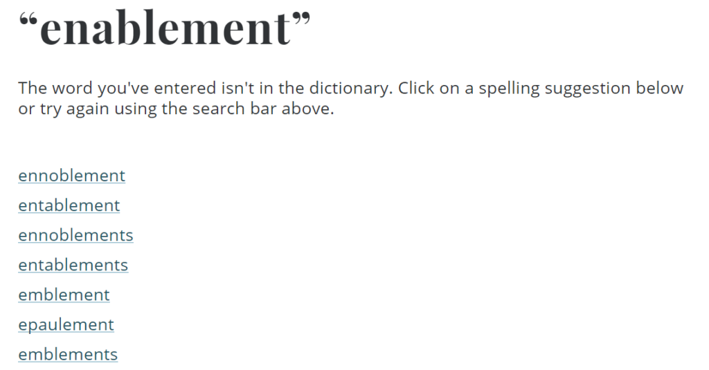 There's sales enablement, organizational enablement, and tech enablement. There's also business enablement, enablement managers, and enablement salary. All you have to do is Google search this word and before you're finished typing, your drop-down will include even more types of enablement. In fact, it'll produce nearly 60 million results. But did you know that the word 'enablement' isn't even recognized by Merriam-Webster, keepers of America's most prominent dictionary? It's true—search for enablement on the Merriam-Webster site, and you get this collection of words that are close, but not it: