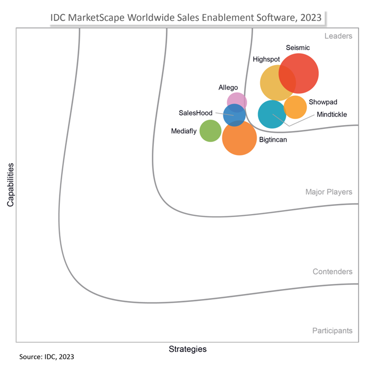This month, IDC published its first-ever IDC MarketScape for Worldwide Sales Enablement Software 2023 Vendor Assessment (doc #US49707723, June 2023) report in which Seismic was named a Leader. The IDC MarketScape considered vendors based on three criteria: recurring revenue, customers, and software that supports content, training and coaching, and analytics.